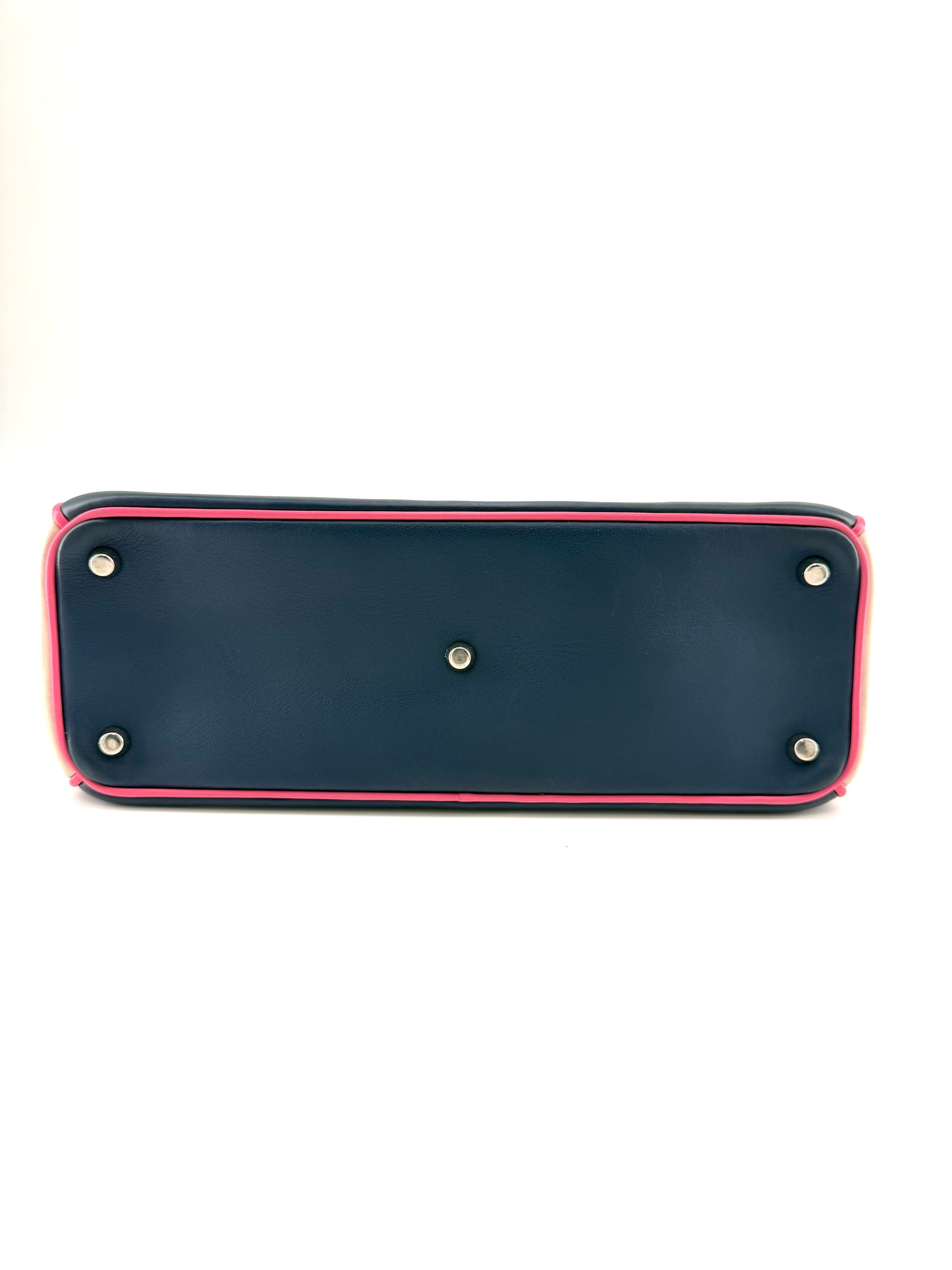 Condition: Good. Minor marks along exterior pink piping. Exterior shape is relaxed. Interior has a hairline pen mark on left pocket. Single loose stitch next to magnetic clasp.
