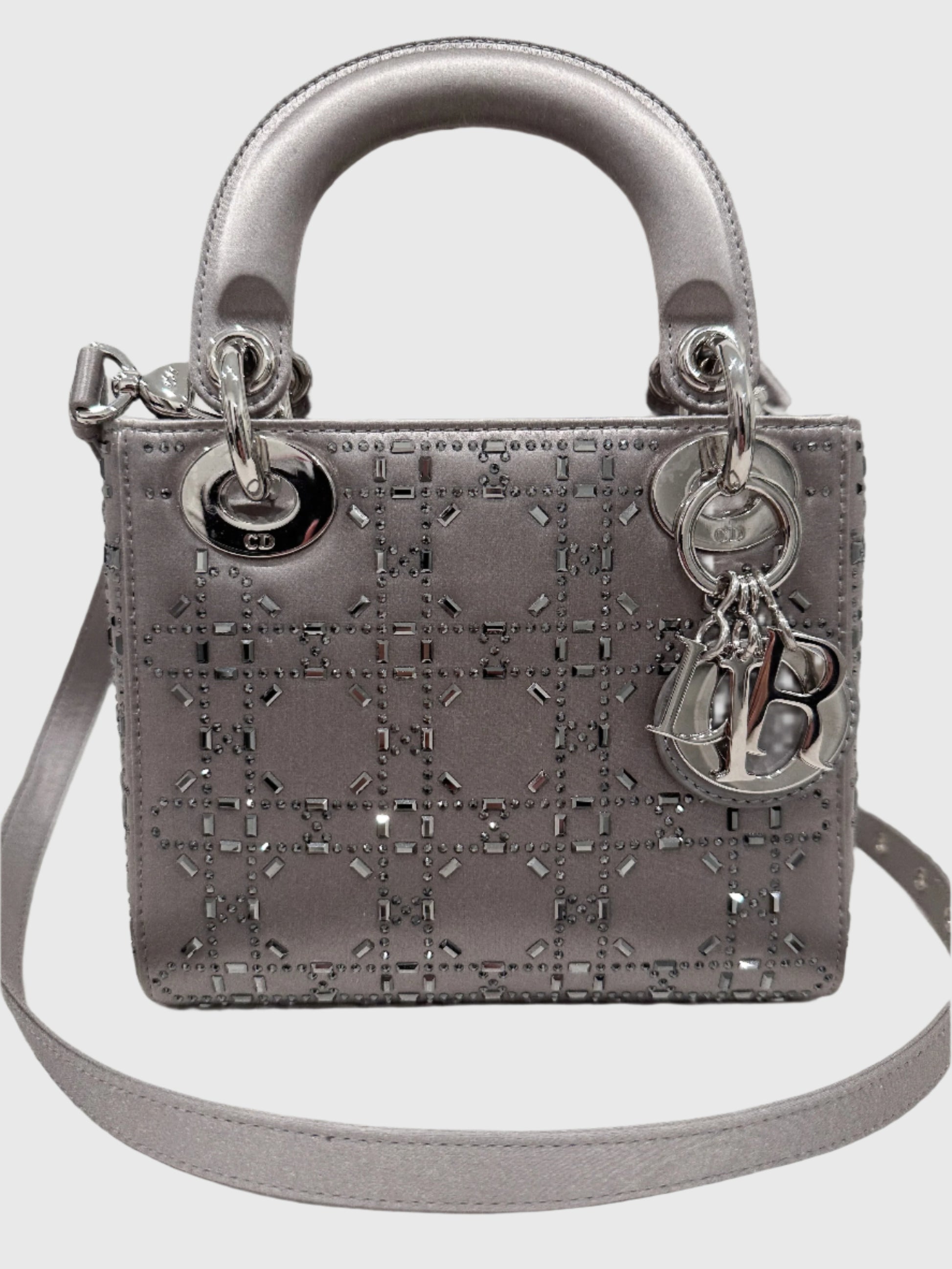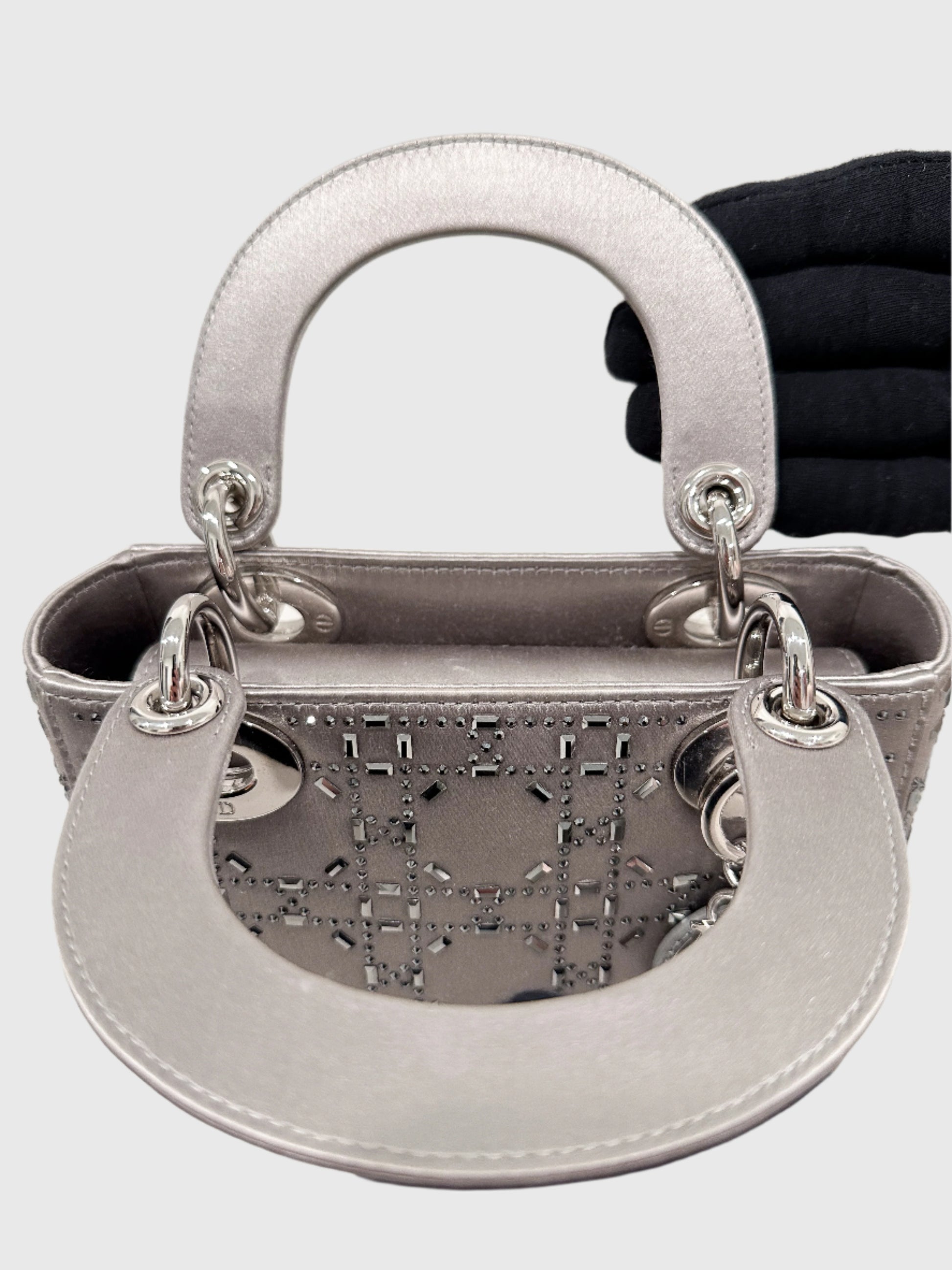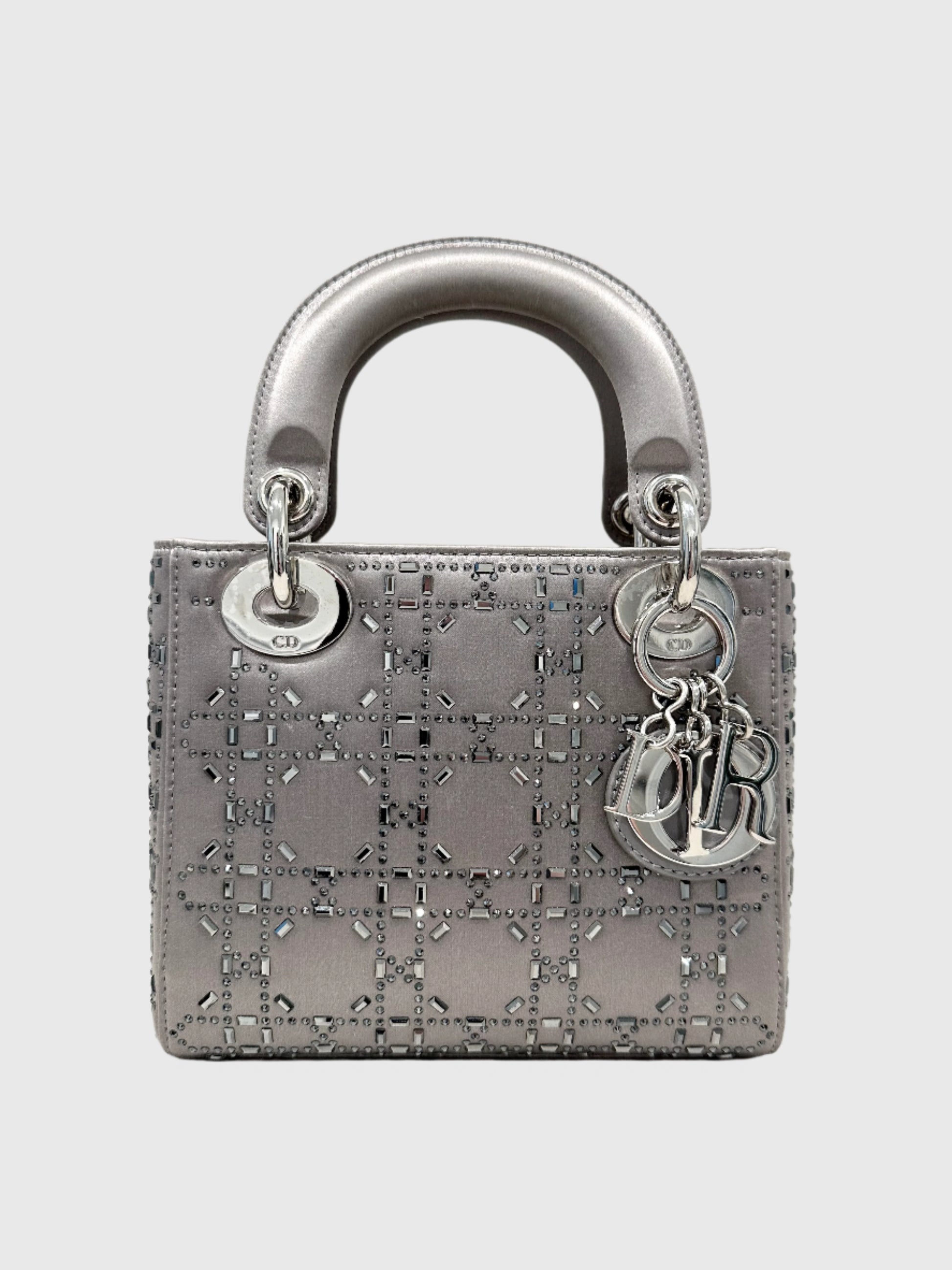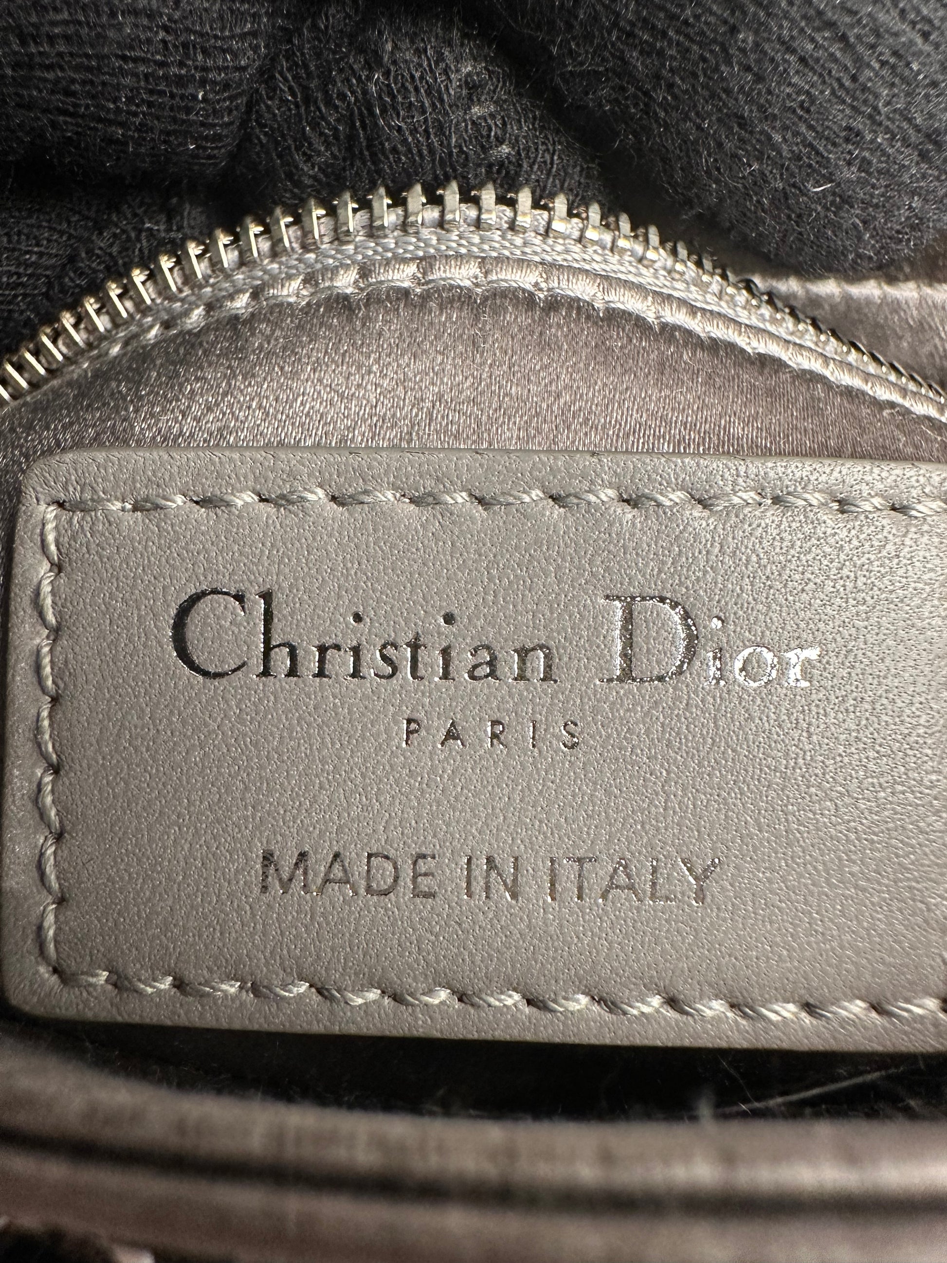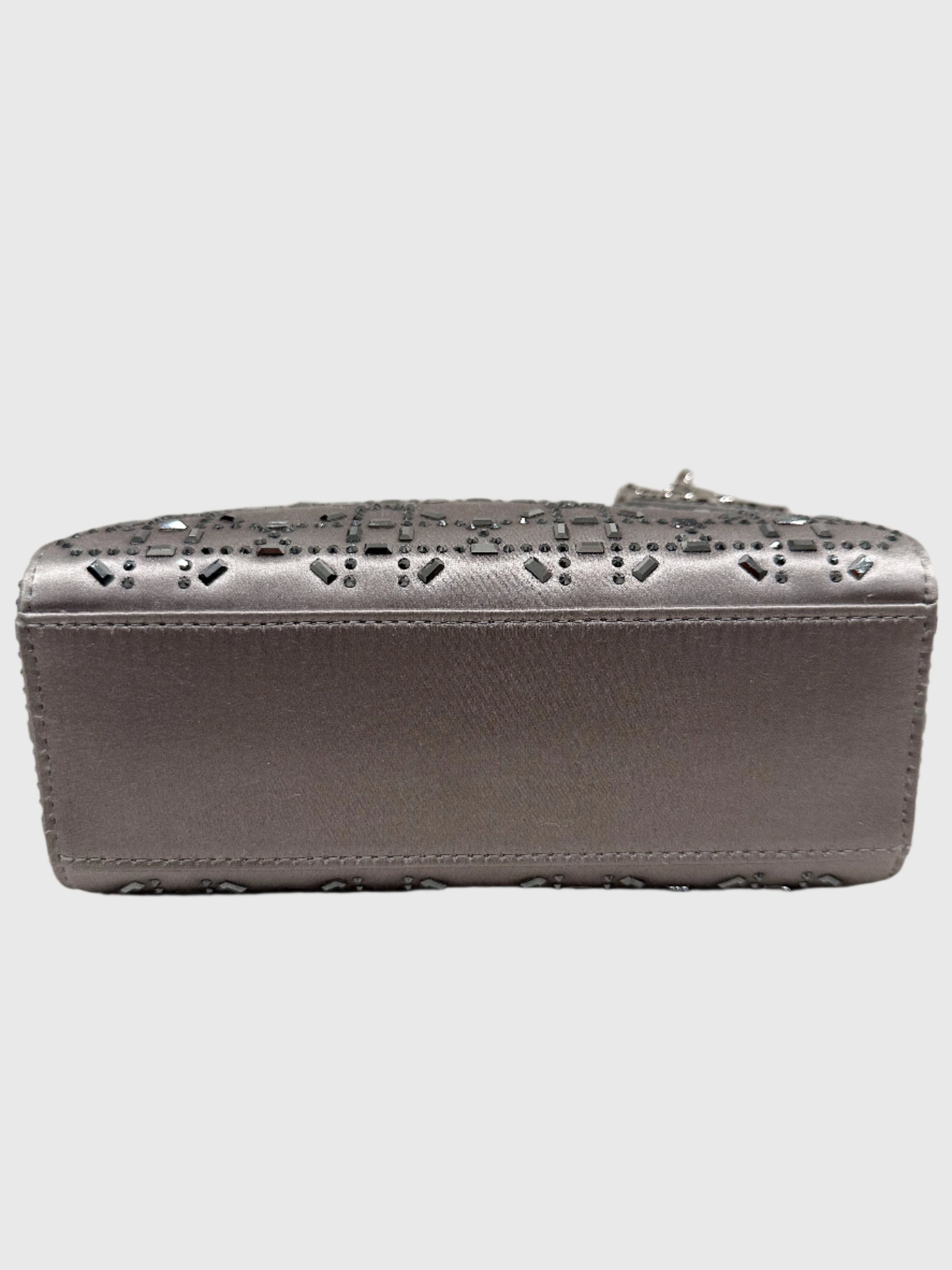 Christian Dior Gray Satin Crystal Cannage Mini Lady Dior Crossbody Bag