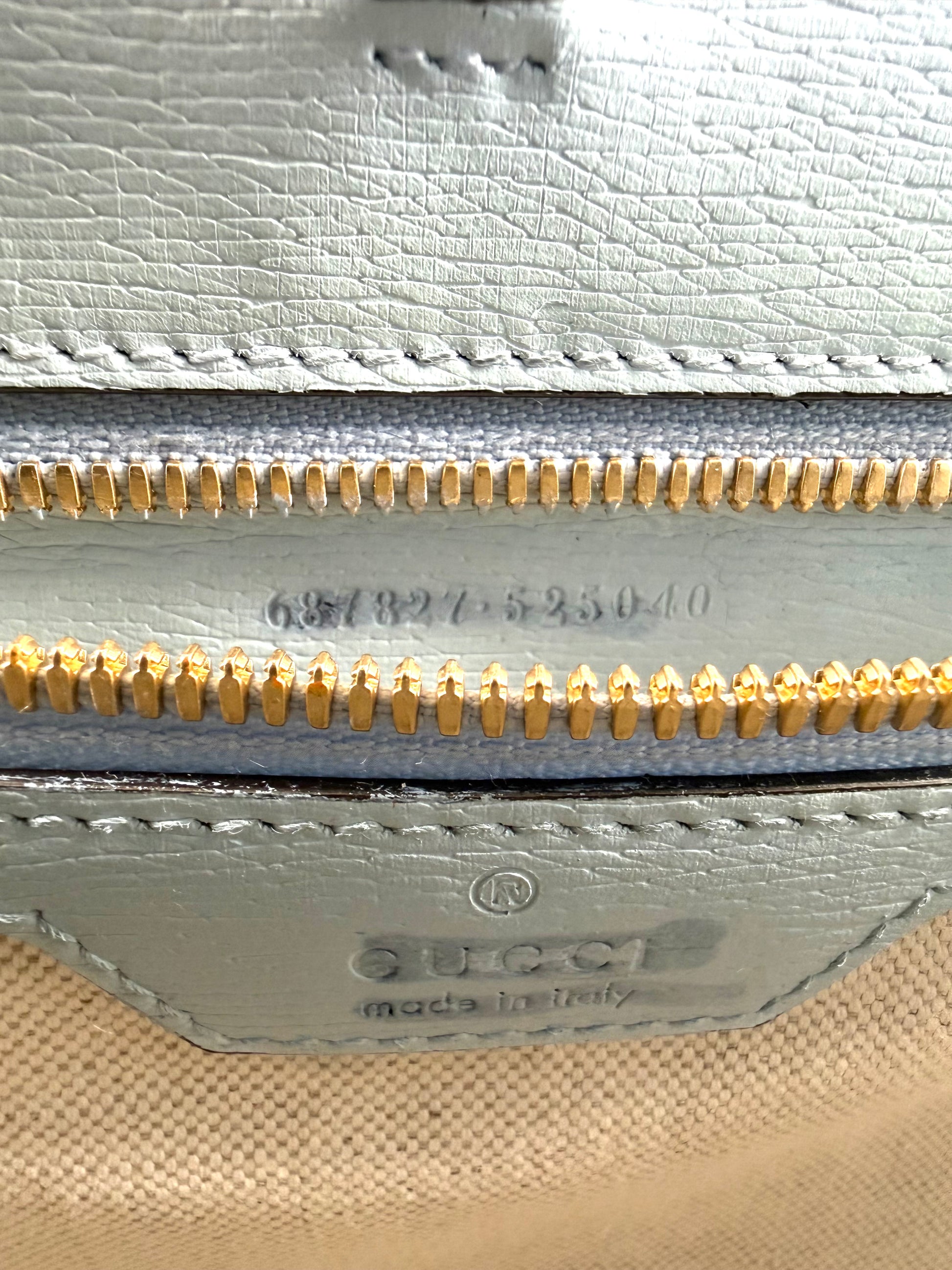 Condition: Good. Minor wear along exterior edges. Smudge on Gucci logo and serial number located in the interior.