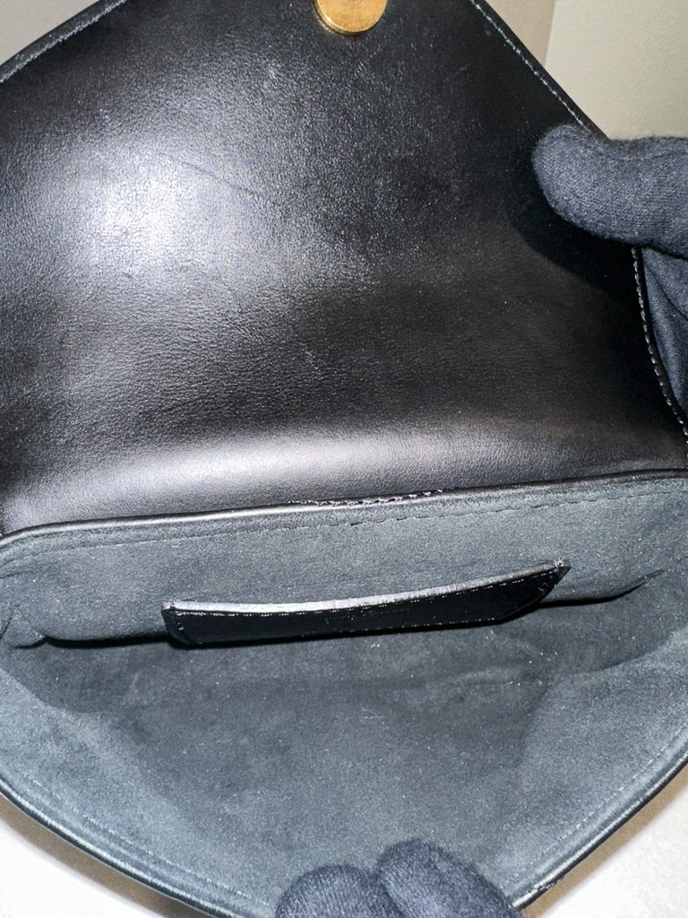 Condition: Very Good. Exterior back leather has scratches on bottom left and small rub on top right. Hardware has light scratches. Clean interior.
