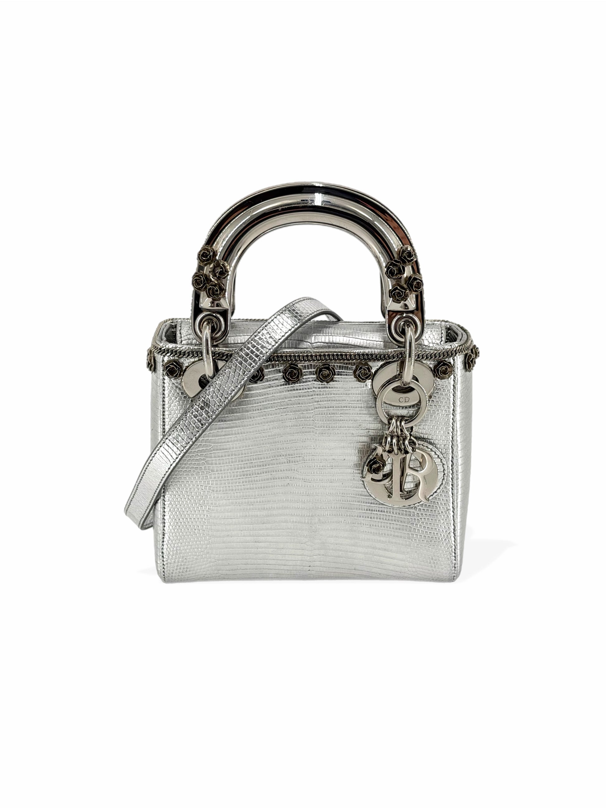 Pre-Owned Lady Dior Lizard with Rose Applique Mini Crossbody Bag