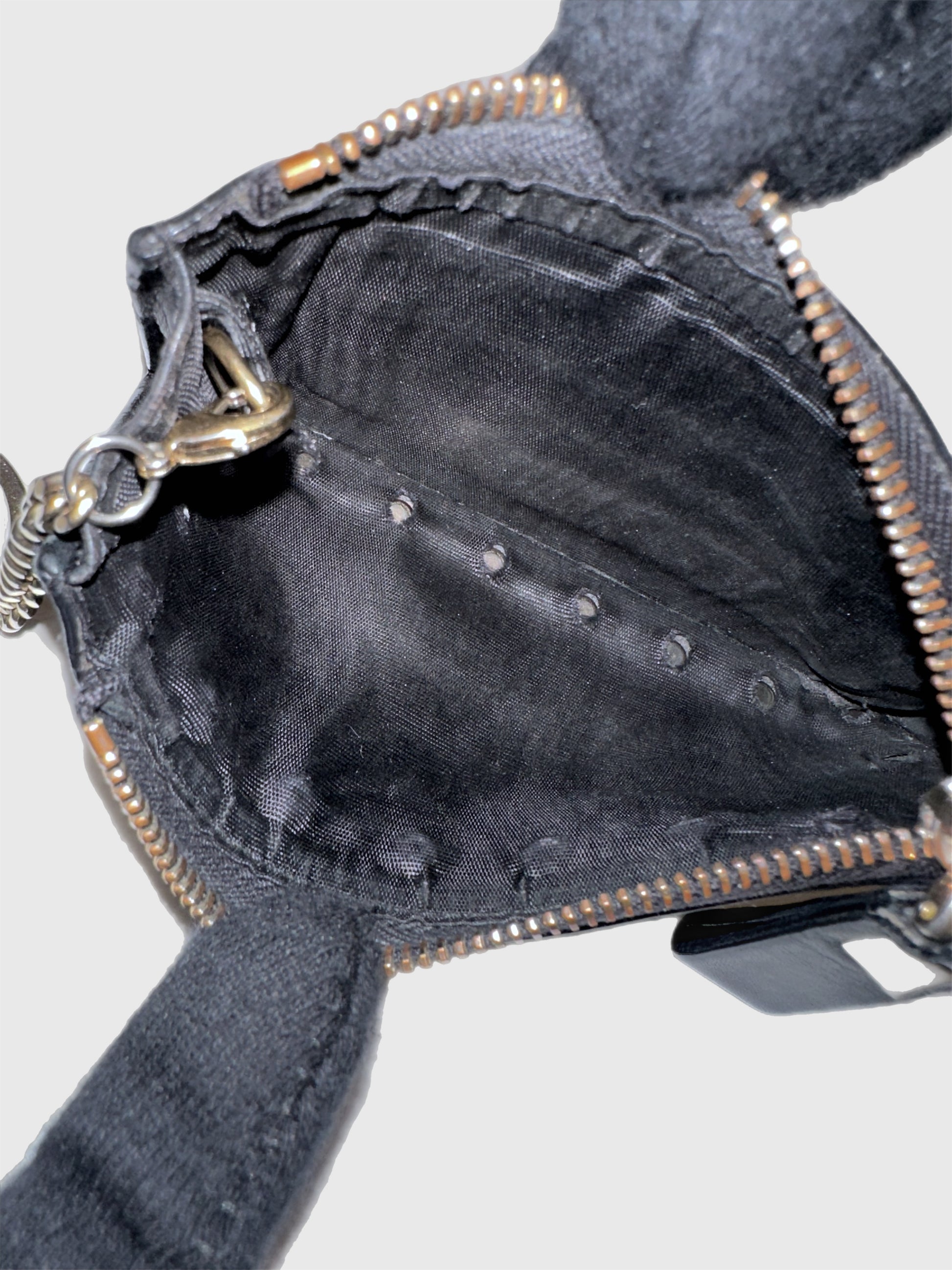 Condition: Good. Tarnish on zipper and zipper pull. Minor surface marks on exterior. Moderate wear on interior fabric lining.